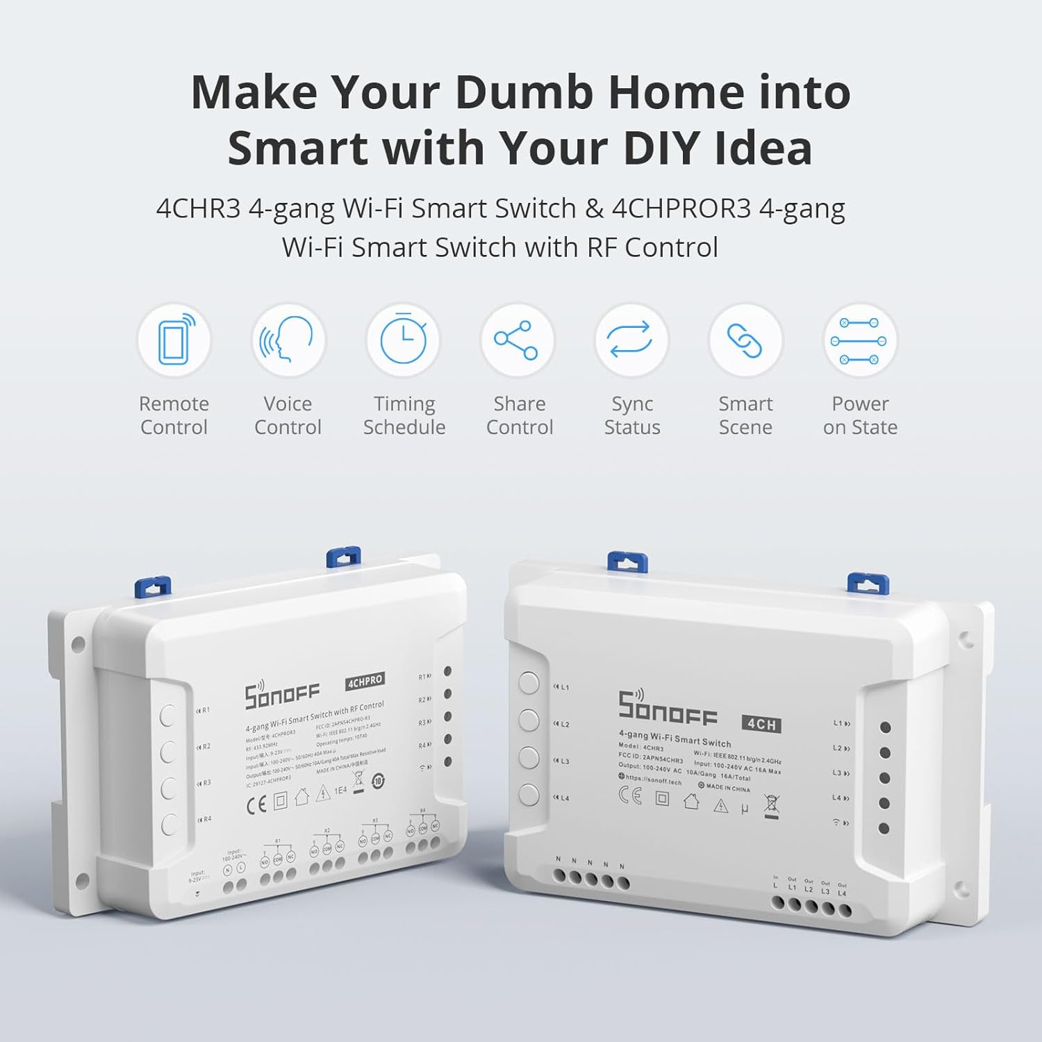 Sonoff 4CH Pro 4CH Pro R2 are 4 gang WiFi switches They support switching among 3 working modes interlock self locking inching mode and both supports to set 1 16s delay in inching mode This feature allows you to let your switch turn on for a few seconds then goes off which works like a pulse switch They integrate with a 433 92MHz RF receiver module making them possible to be controlled by RF Remote The smart switches are DIN Rail mounted Users can remotely turn on off the connected lights appliances by iOS Android App eWeLink or 433MHz RF Remote They can create 8 enabled single repeat countdown timers to automatically turn on off at the specified time The timers can run themselves even when the network is unavailable To let the devices be controlled by others users can simply share the devices to other accounts and allow specified timers permissions Users can even create some scenes or smart scenes to trigger ON OFF the switch