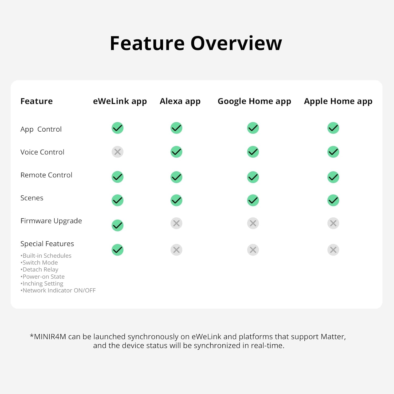 【Matter Compatible】SONOFF MINIR4M is a Matter certified device, it can work with other brands of Matter end devices and integrate with Matter compatible platforms, such as Alexa, Apple Home, Google Home, etc. Controlling all smart devices through a single app is no longer a fantasy.