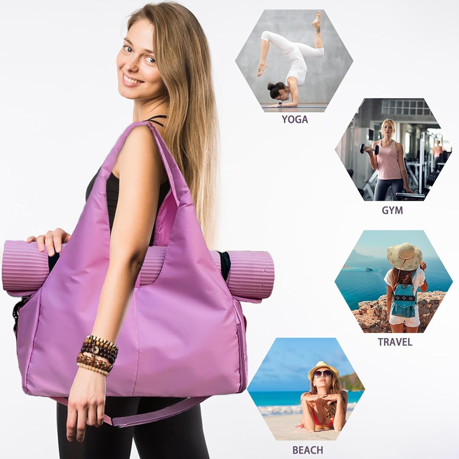 【Applicable Scenarios】This stylish, versatile, and lightweight yoga fitness travel bag is very suitable for yoga exercises, sports occasions, travel, cycling, outdoor sports, shopping, work, leisure, etc. You can also use it as a holiday gift for birthdays or Thanksgiving, Christmas.