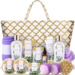 [Pampering 15pc Home Bath Set] – Bathing with a fragrant and delightful assortment of luxury at-home spa products. Includes: Soap, Shampoo Bar, Lavender Massage Oil, 2pc Bath Bombs, Shower Gel, Bubble Bath, Body Lotion, Body Scrub, Bath Salt, Bath Puff, Body Brush, Hand Cream, Dry Hair Cap, Handmade Tote Bag.