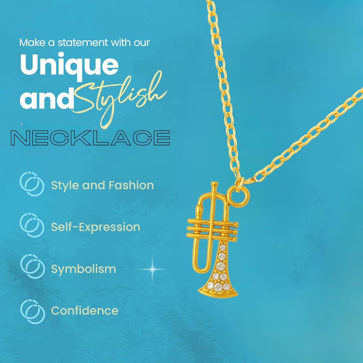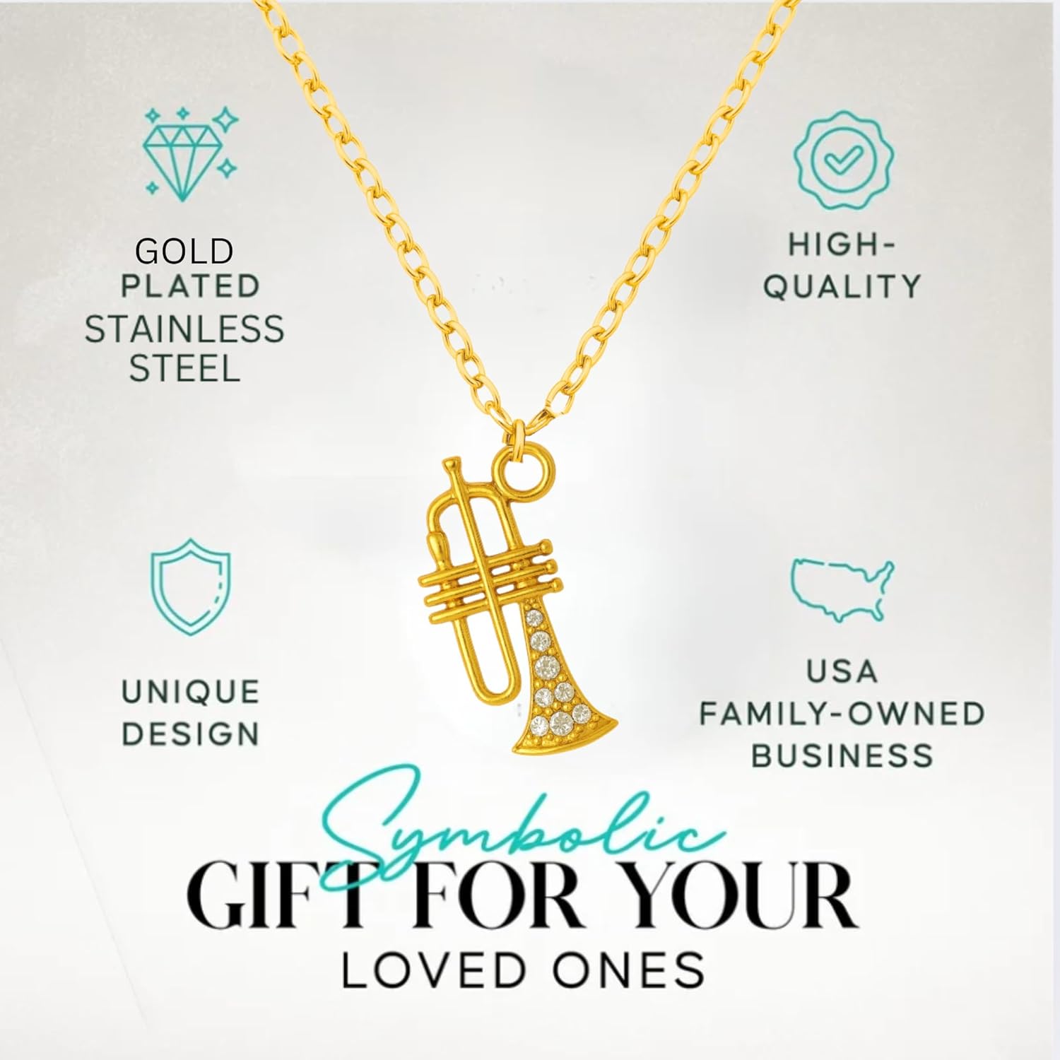 This trumpet necklace features a polished stainless steel charm with crystal accents, offering a stylish and meaningful gift for music lovers. With its lightweight design and durable finish, it is perfect for daily wear or special occasions like recitals and concerts. Ideal for jazz fans, band members, and musicians looking for a subtle musical accessory.