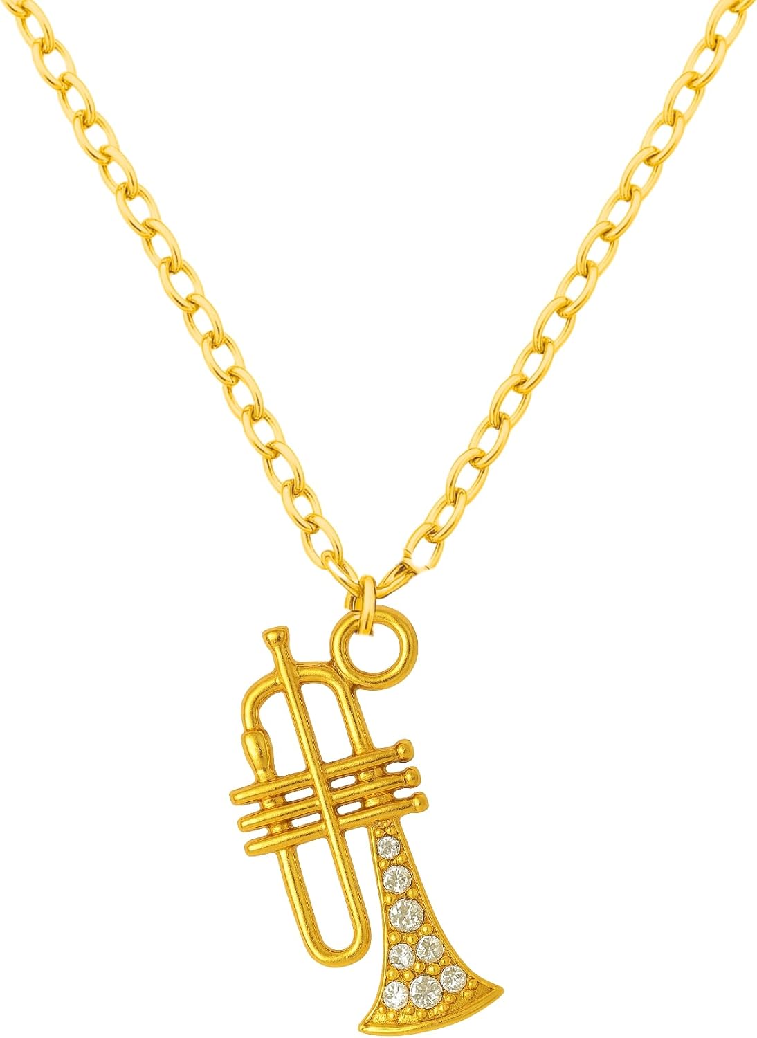 Sportybella Trumpet Necklace Gold Stainless Steel Pendant with Chain, Crystal Accent, Lightweight Music Jewelry Gift for Jazz Lovers, Band Members, Recital Accessories, Musicians