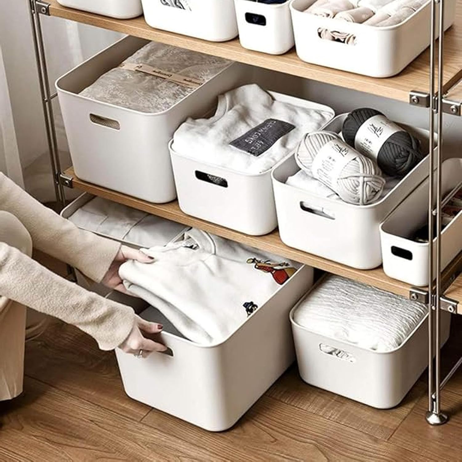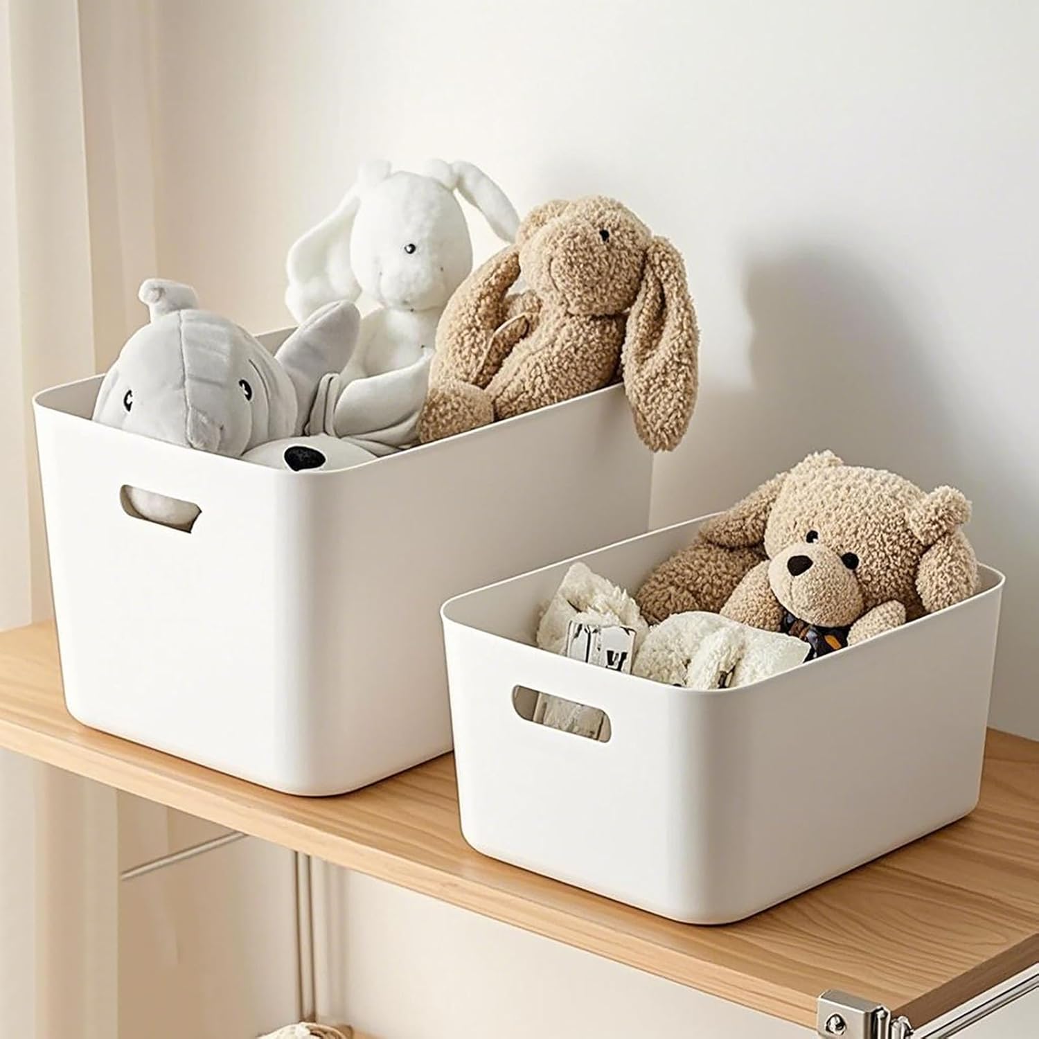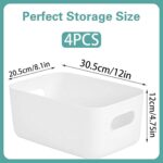 Ideal Storage Solution: you will get 4 white plastic storage baskets to make organization easier and help keep your space tidy, you have enough bins to easily store your items and are also great for sharing with others; Storage boxes maximize your space.Designed to keep your closet neatly organized.Please note that this product needs to be stacked and packaged due to transportation requirements; it requires some skill and strength to open when received; if it is a little deformed, please place it at the bottom and leave it for one day to restore its original shape