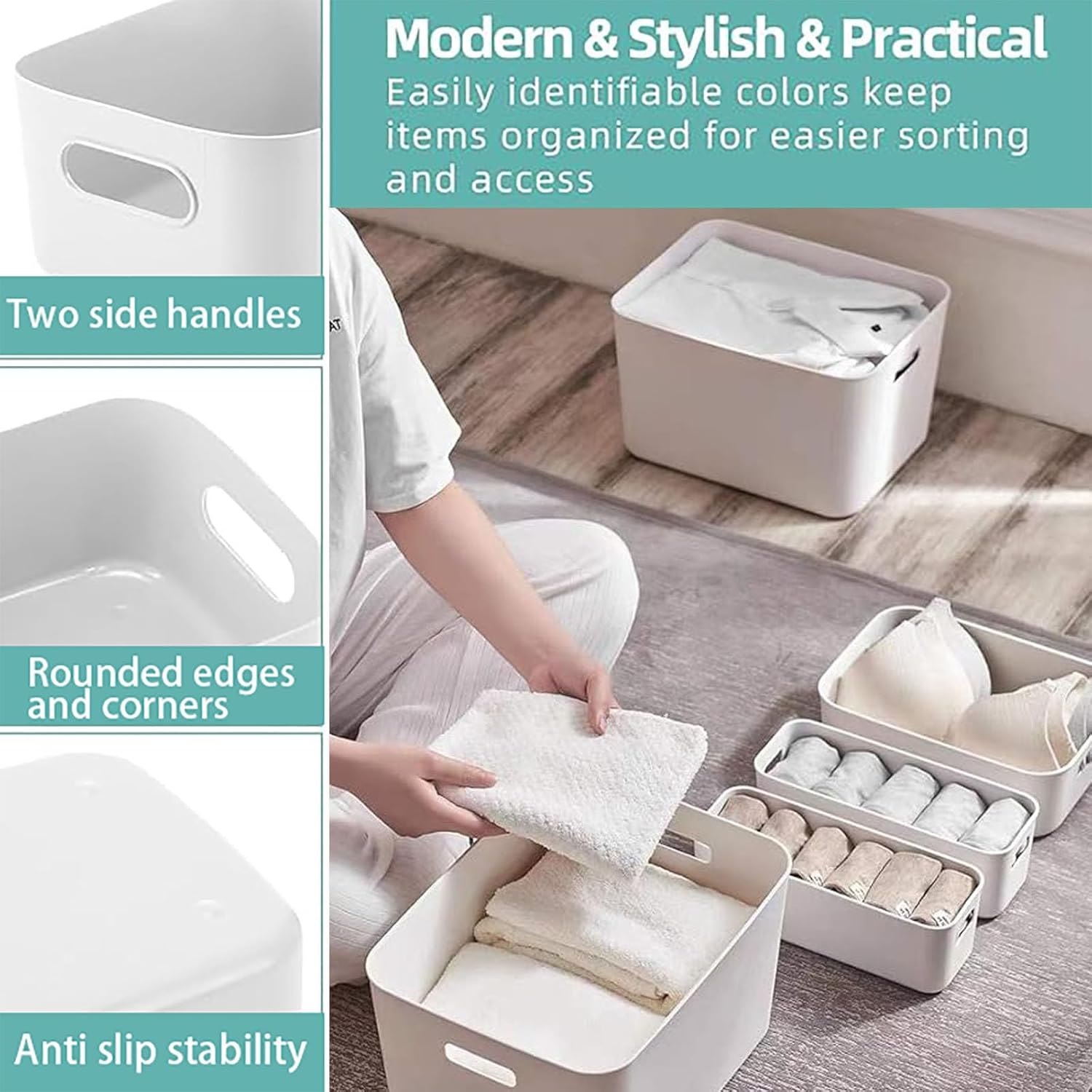 “These sturdy and long-lasting storage bins are made of premium durable plastic. It is BPA free. They are in nice white and elegant design. They are perfect to fit all your rooms.Designed to keep your closet neatly organized. Our organizer bins are great for home and office use for organization. Also use for the bathroom, laundry room, kids room and kitchen. Expand your possibilities with our versatile organizer.If you have any questions or doubts after receiving the product, please feel free to contact us. We will provide you with a satisfactory solution within 24 hours. ”