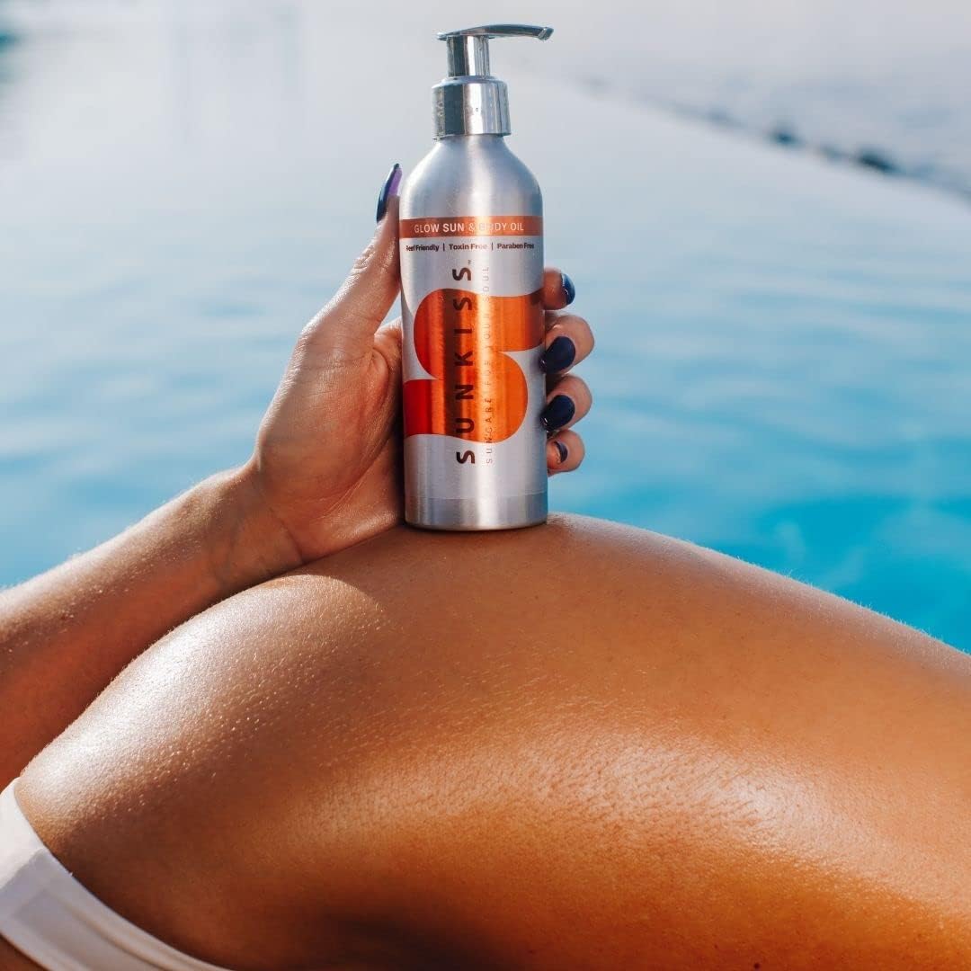 SunKiss Glow will accelerate and enhance your tan with a vitamin-enriched formula that absorbs deeply into the skin delivering a glow from head to toe. Nourish, replenish, and hydrate thirsty skin with this mix of natural botanical and moisturizing oils. Full of vitamin E, tanning accelerators, and natural SPF the formula includes Raspberry Seed, Coconut, Carrot, Jojoba, Wheat Germ oils and antioxidants to nourish replenish and hydrate thirsty skin. Infused with our signature scent of tropical coconut this skin enhancer will prolong your existing whilst leaving a healthy radiant luster. SunKiss Glow is free from toxins, harmful chemicals, silicones & parabens and is biodegradable, reef-friendly, cruelty free and vegan. NOTE : This product does not contain UV protection nor does it protect against burning. It is not a self tan product. We recommend SunKiss with an SPF for prolonged sun exposure.