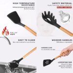 The premium silicone food grade silicone can withstand temperatures from -40°F up to 446°F/230°C. They are scratch-resistant and will protect all types of cookware from any scratches such as nonstick pots and pans. The handles are made of natural wood which is eco friendly, stylish, and easy to clean. A utility hanging hole on each wooden handle for convenient storage organization using hooks or a wall mount.