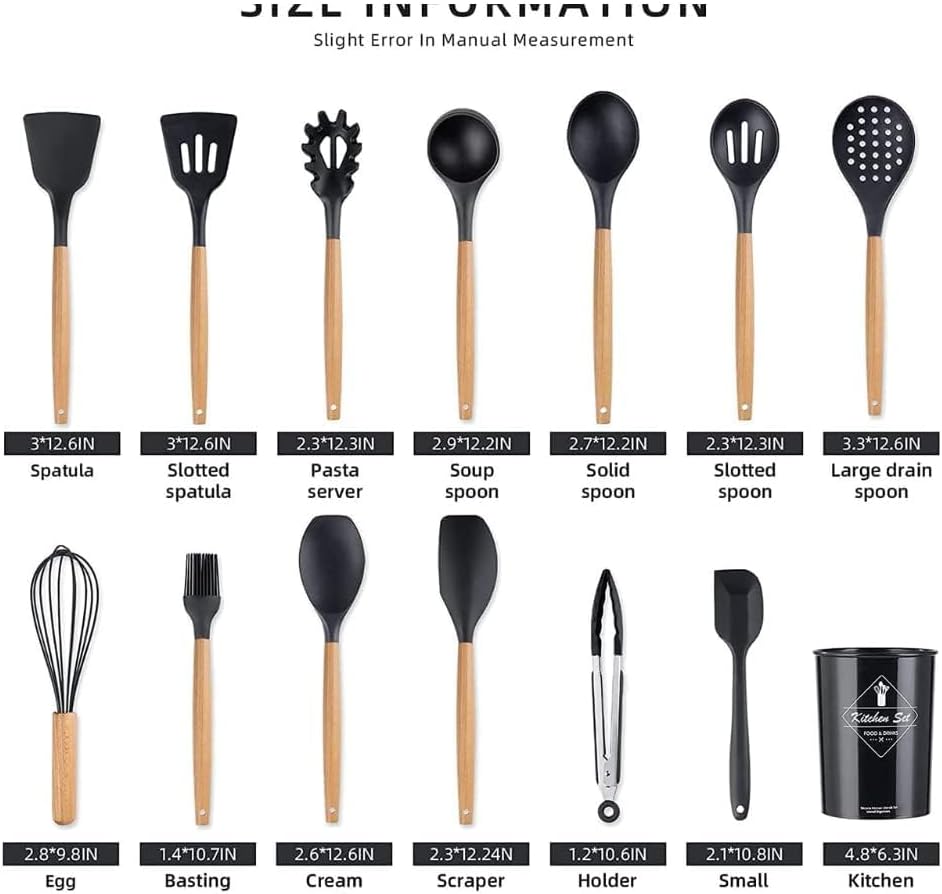 11 different kinds of tableware make your cooking more interesting and easy, and meet your various cooking needs. Silicone kitchen cooking utensils include Skimmer, Slotted Turner, Soup Ladle, Pasta Server, Solid Spoon, Spatula Spoon, Large & Small Spatula, Basting Brush, Whisk, Kitchen Tong. Our 11-piece utensils set is a complete set of accessories you will need to make the maximum out of your wonderful little kitchen appliance. Could be used in dishwasher. Never soak the wooden handle in water for long times which may result in cracks. just hang them up-to-down to dry and avoid harboring bacteria growth. Package Including: Storage bucket x 1 Spoon x 1 Colander x 1 Spatula x 1 Flat spoon x 1 Shovel x 1 scraper x 1 Spaghetti Claws x 1 Food tongs x 1 Spoon x 1 Oil brush x 1 Whisk x 1 If the product has quality problems, please contact us in time and we will handle it for you.