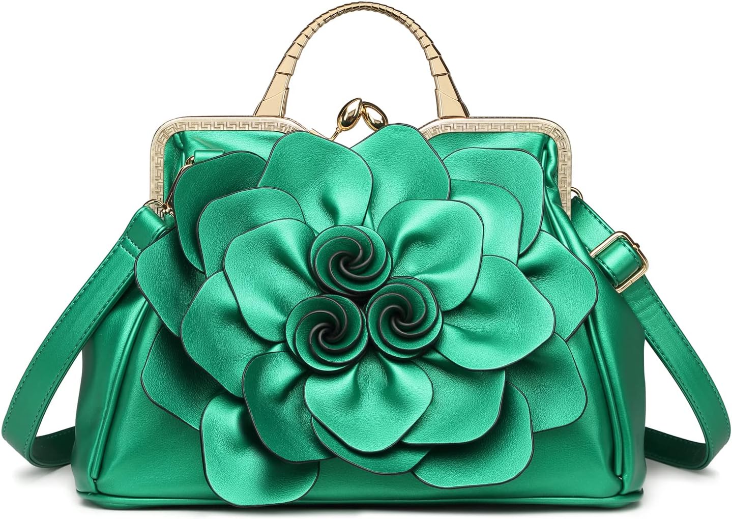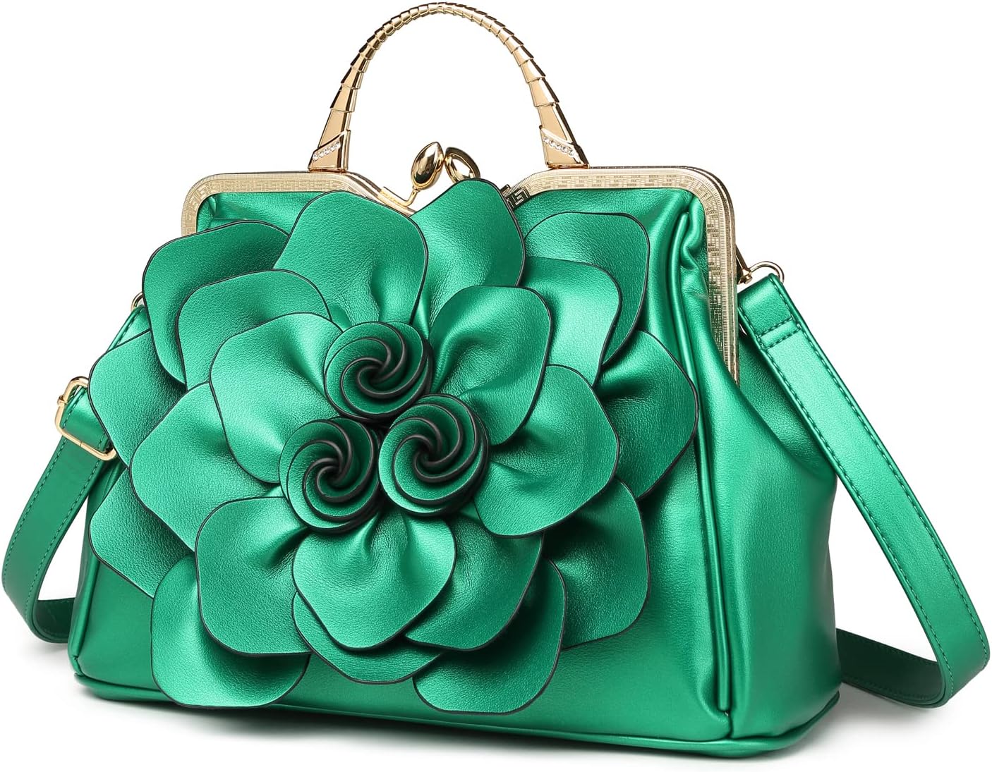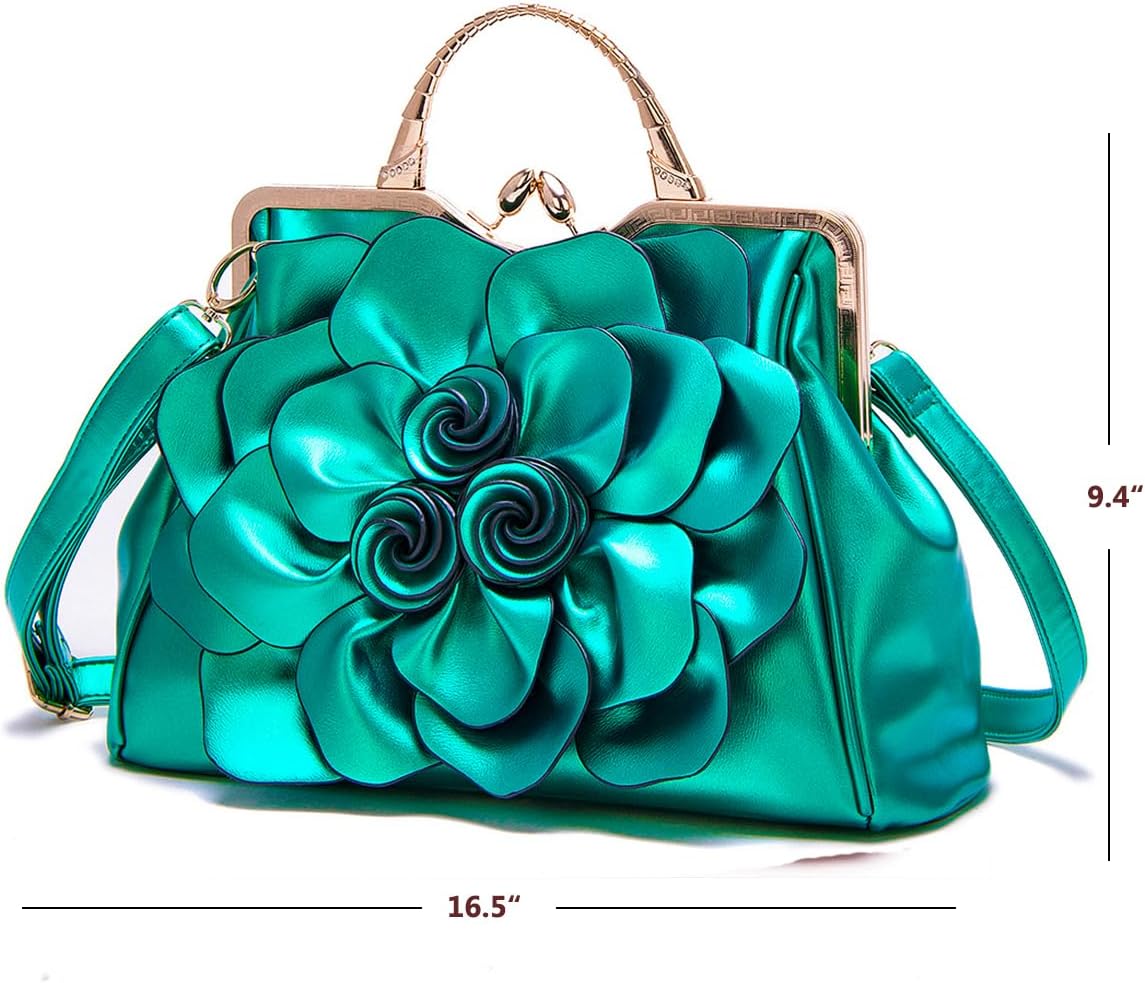 There are unique 3D rose flower design, metal handle with rhinestones, and the brass stubs on the bottom. The way of closure is the metal button. The bag has a main compartment, with two zippered and two open pockets inside. It would fit your life necessities, as well as wallet, cell phone, and some beauty items, etc. There is also a zippered pocket in the back for your cards or note cards.