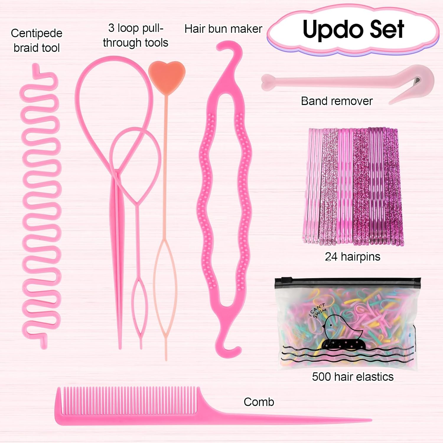 【Updo Set】 This Tail Hair Tools set includes various practical tools: 500 hair elastics, 3 loop pull-through tools, a hair bun maker, centipede braid tool, a parting comb, band remover, and 24 hairpins. Whether for daily styling or special occasions, this set meets your diverse needs, making your hairstyles more versatile and refined.