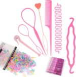 Tail Hair Tools, Hair Loop Pull Through Tools, Hair Braiding Tools with Hair Elastics Hair Plaiting Rat Tail Comb Bands Remover and Hairpin, Hair Updo for Girls Women French Hair Styling (Pink)