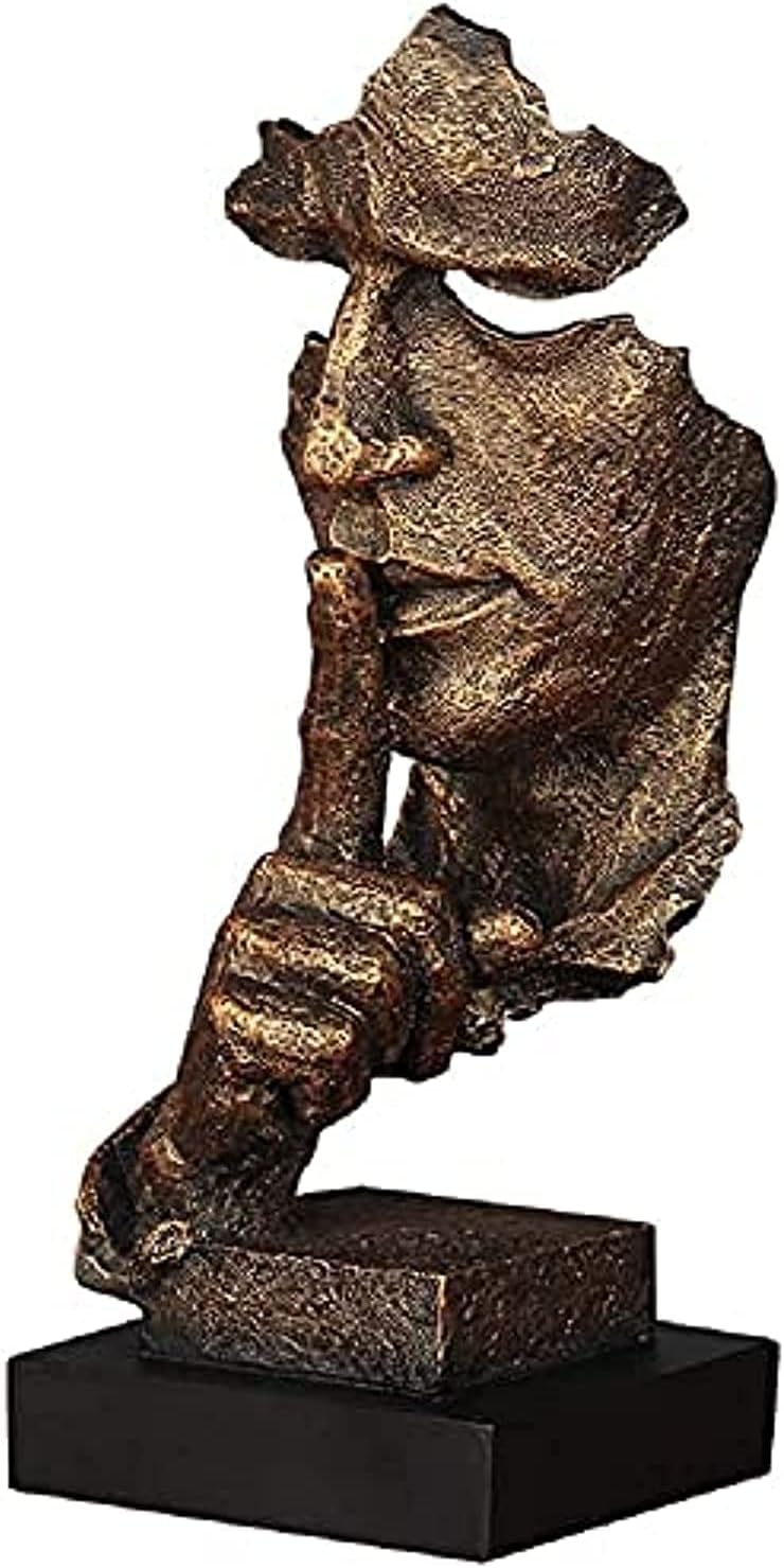 A striking ornament for modern homes and contemporary office spaces, this Shh! Be Quiet Bronze Face Sculpture quietly demands attention. Beautifully presented on a black marble effect plinth, it features a cut-out of a man s face resting peacefully against his finger to portray the universally recognised gesture of shush or be quiet . * A beautiful statue perfect for displaying on a shelf for your office and home decoration and a perfect gift for your friends or family.Do the old-style retro style, Whether it is a living room, Study, Office, Cafe is a beautiful landscape. * Hand-made,each sculpture is unique,the vintage level of each sculpture is not exactly the same. * Perfect gift for those that love art. Perfect for housewarmings, it is sure to impress those with artistic flair. Specification: Material:resin Size:35*13.2*12.2CM Products include: 1 * Abstract Thinker Figurines Note 1. Please allow 1-10mm deviation due to manual measurement. 2.Due to light and screen difference, the item s color may be slightly different from the pictures. 3.Traces of uneven porosity in some details, which are eligible for normal process.