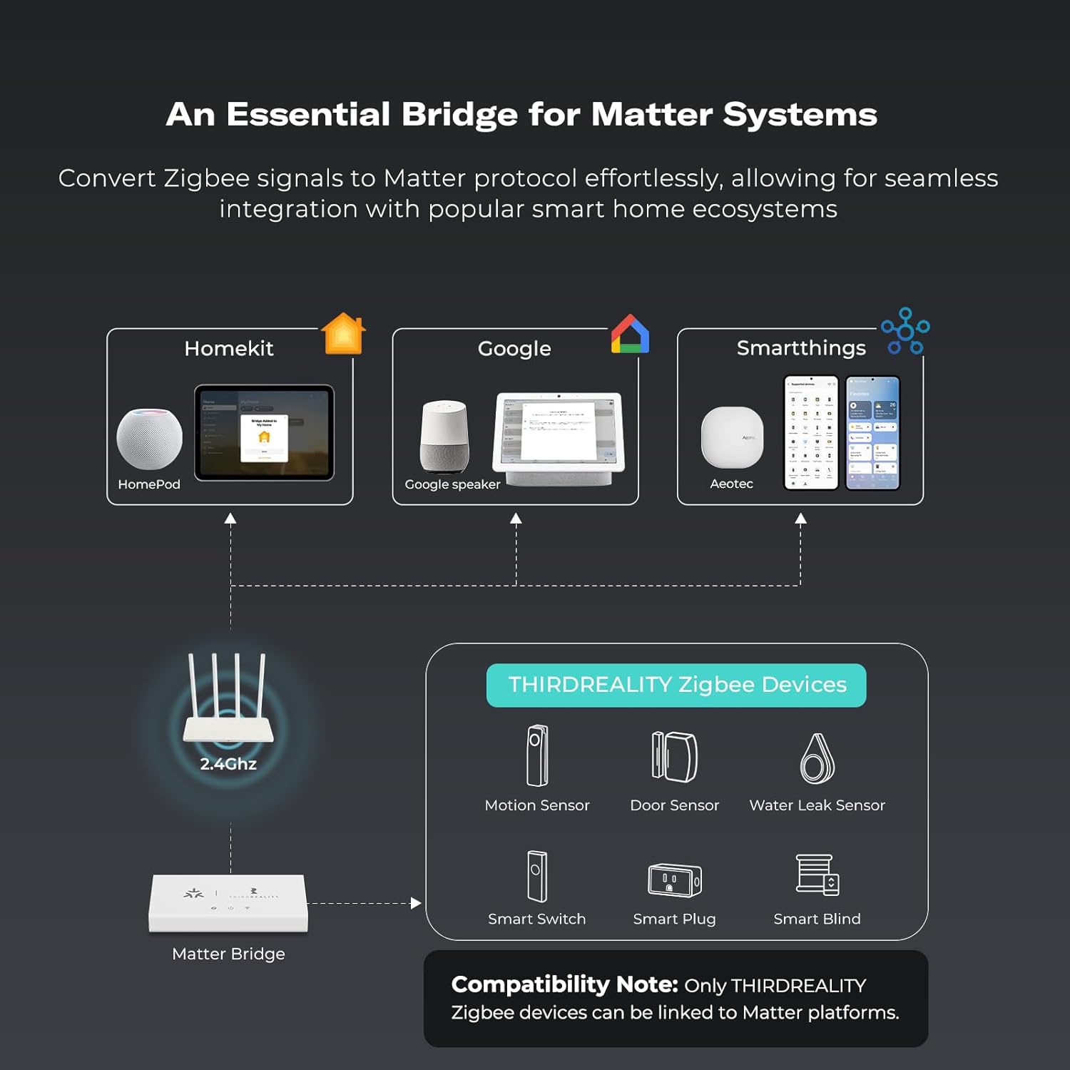 Zigbee to Matter Connectivity: The Smart Bridge MZ1 effectively links THIRDREALITY Zigbee end devices to the Matter protocol, enhancing their functionality in the broader smart home ecosystem. Note: Specifically operates on a 2.4 GHz Wi-Fi network.