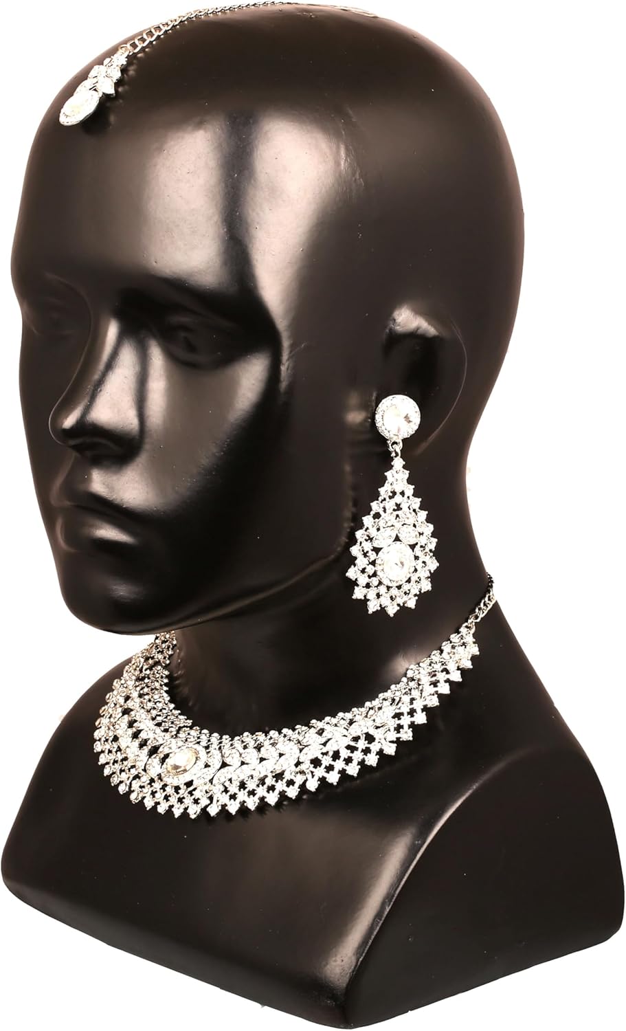 Touchstone Hollywood Glamour scintillating white round and rivoli shape Rhinestone grand bridal designer jewelry hasli necklace set for women in silver tone
