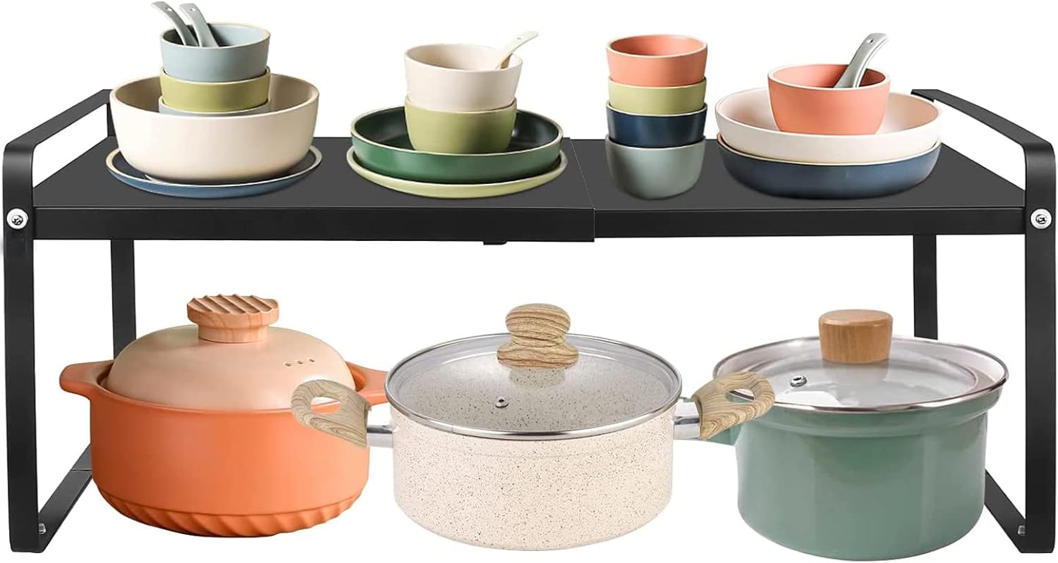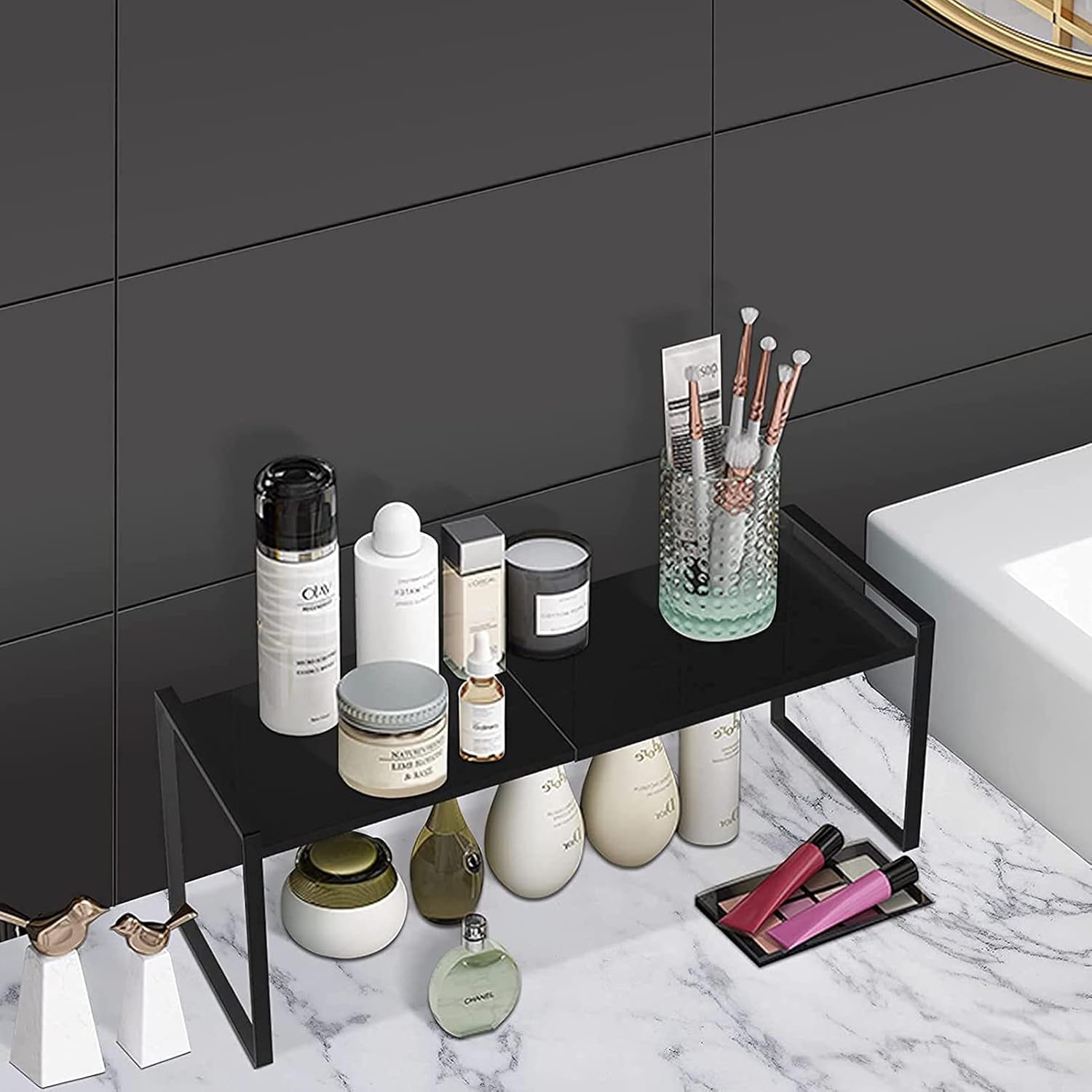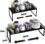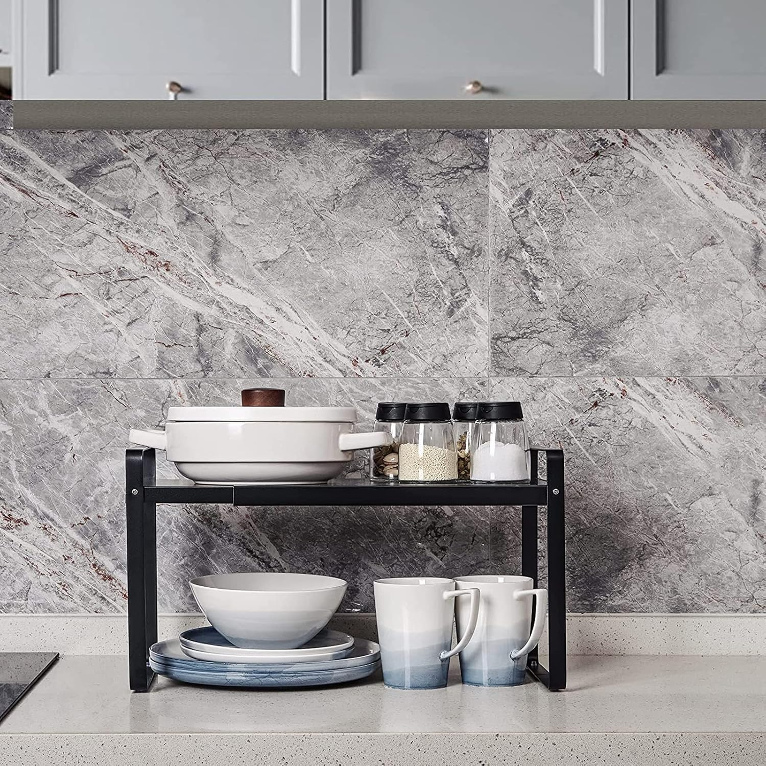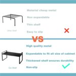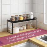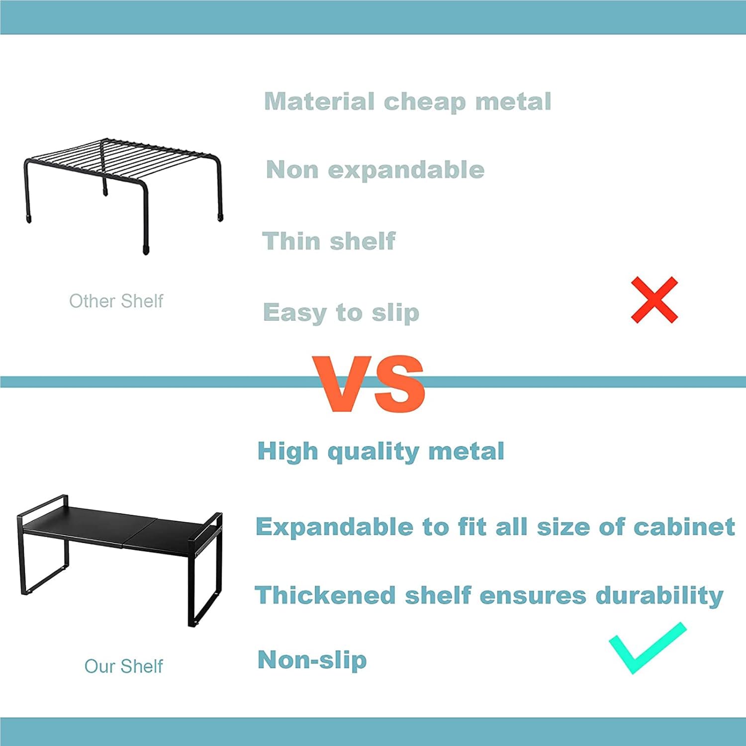 【Expandable Storage Shelf】Expandable shelf space about from 15.27 to 24.80 inches. The simple and artful overlapping shelf design for optimal storage.Perfect for keeping everything organized in kitchen cupboards, pantries, bathroom cabinets, closets, countertops, under the sink. NOTE: 1 PCS