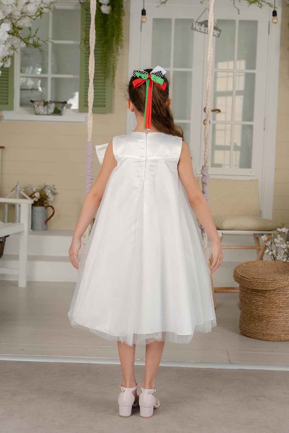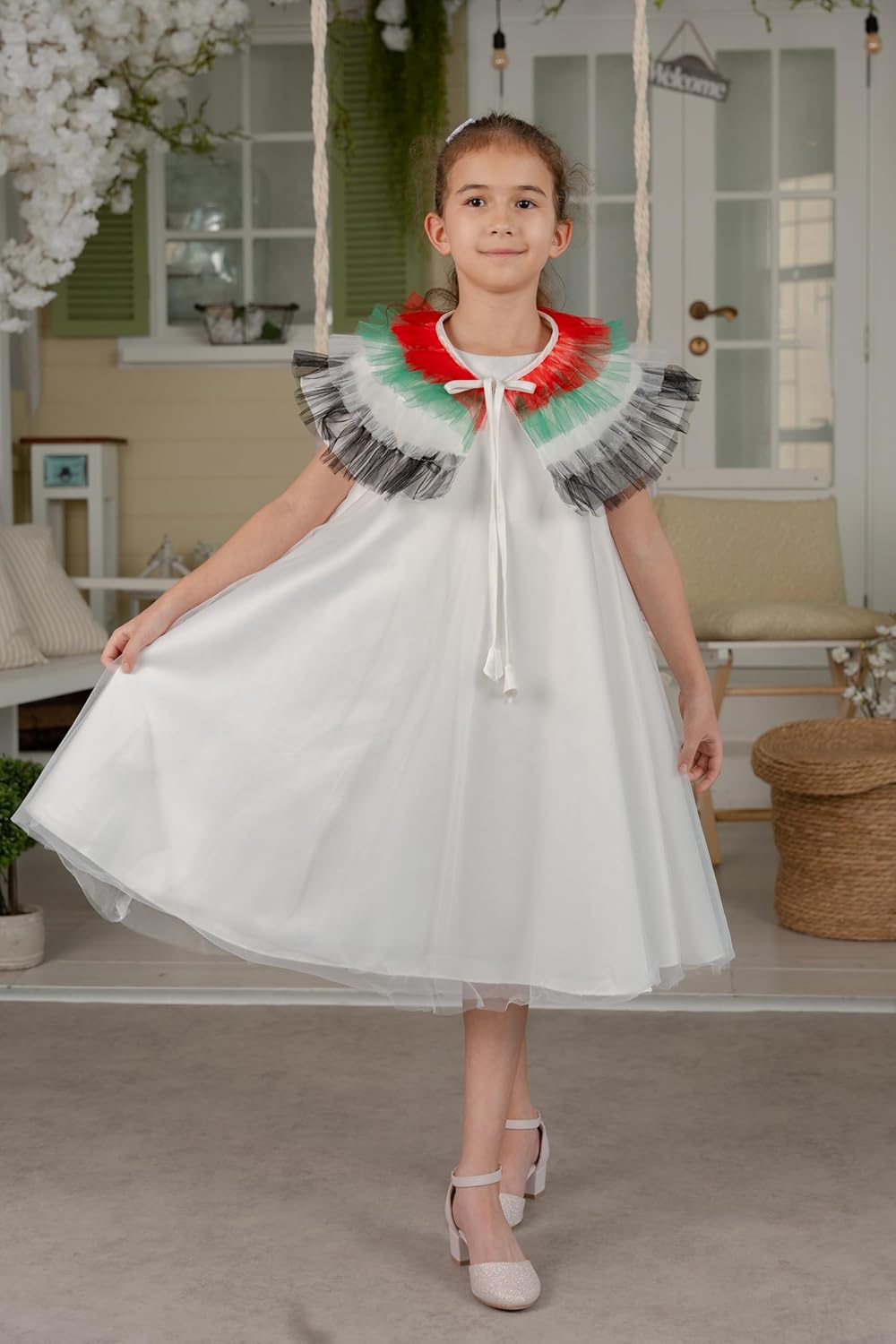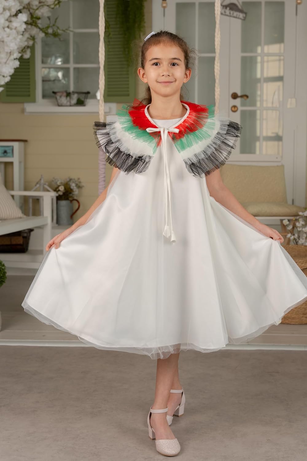 Embrace the spirit of festivity and national pride with this delightful UAE Flag and EID dress from Khadija Collection. Crafted with meticulous attention to detail, this flowing, lightweight dress features a crisp white base adorned with vibrant red, green, and grey frills that evoke the colours of the UAE flag. The sleeveless design and airy fabric ensure your little one stays comfortable throughout the celebrations. With its elegant yet playful aesthetic, this dress is a perfect choice for Eid gatherings, National Day events, or any occasion where you want your child to radiate joy and patriotism. Pair it with dainty flats or sandals for a complete look that exudes charm and cultural appreciation. Celebrate in style with this UAE Flag and EID dress from Khadija Collection.