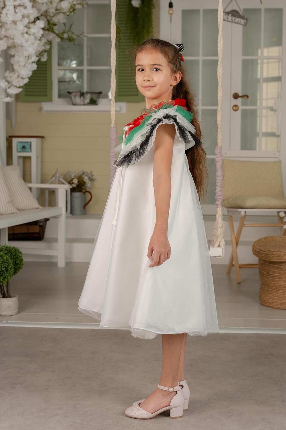 UAE Flag and Eid Dress for Girls, Tulle Dress with Colourful Feathers