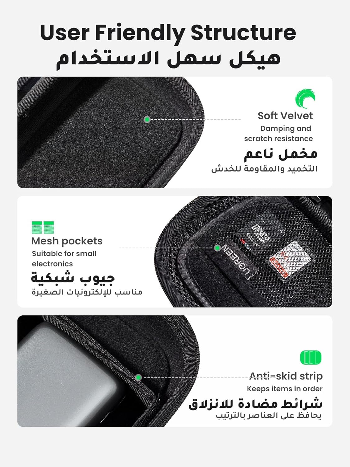 【Large Capacity】UGREEN tech storage organizer is perfect for travel or daily office use. This small organizer bag fits well to electronic accessories like power bank, earphone, charging cable, usb c hub, 2.5 inch hard drives, 3.5 inch hard drive, flash drive, Mp3 player, etc. With its interior layered design, you can keep all your accessories organized in one cord organizer bag.
