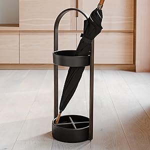 SLEEK AND DURABLE UMBRELLA STAND: An umbrella stand that will look just as good as your furniture, it has four slots for tall umbrellas and two hooks inside the upper ring for small umbrellas