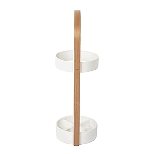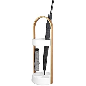 RESIN BASE AND BENT-WOOD FINISH: Features a resin base (in either black or white) which is water-resistant and prevents rusting, and a bent wood handle with an upper steel ring (in either black or white) the helps support the umbrellas while adding an eye-catching element to the structure of the stand. Comes in either white/natural ashwood or black and walnut.