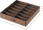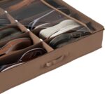 PRODUCT DETAILS — This organizer holds up to 12 pairs of shoes. Fits under most beds. Product features a clear plastic zippered cover and a sturdy nylon fabric handle. Dimensions: 27” (L) x 24” (W) x 5” (H). Color: Brown