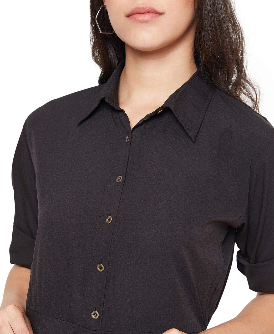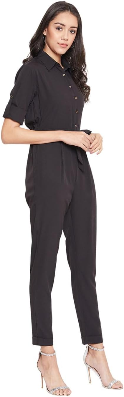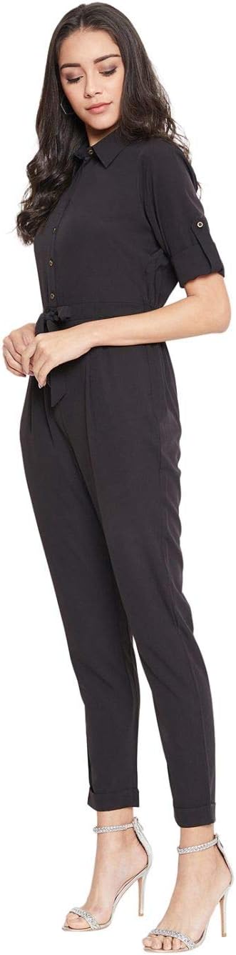 Button down relaxed fit jumpsuit with roll up sleeves and an elasticated waist. The elasticated waist and comfortable hip silhouette is perfect for the Indian body type. Made from smooth, wrinkle resistant crepe fabric, this jumpsuit is sure to look trendy. It is color bleeding resistant thereby making it long lasting. Sweat absorbent armpit lining is used to keep away underarm stains.