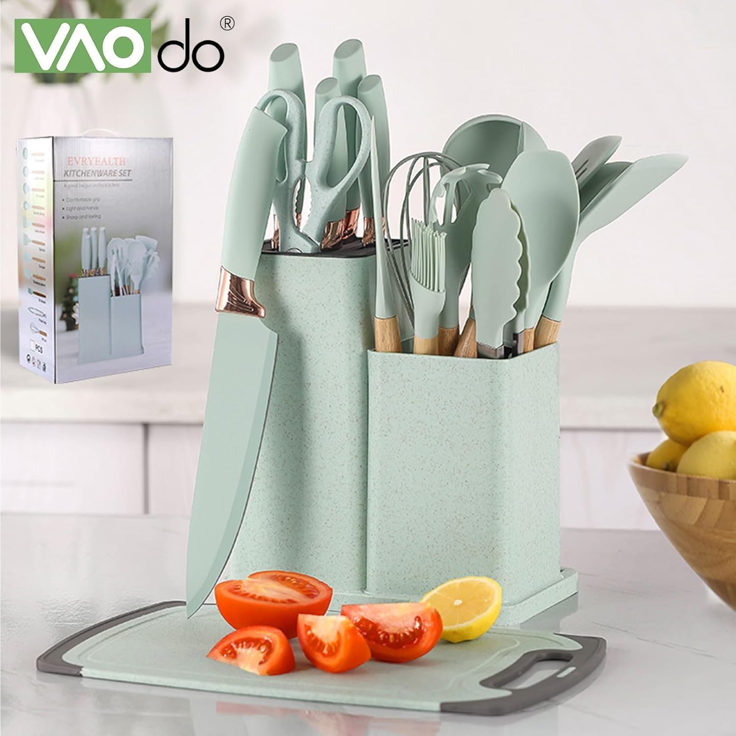 VAODO 19 Piece Kitchen Knife and Cooking Utensils Set, Silicone Cookware Set with Storage Box and Cutting Board, Including Cooking Utensils Set, kitchen gadgets and knives, Green
