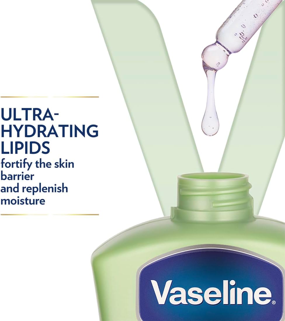 Vaseline Aloe hydrating body lotion contains micro-droplets of Vaseline petroleum jelly to lock in moisture.