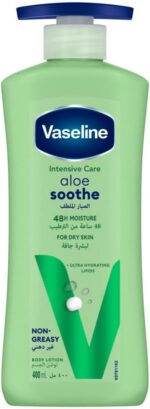 It all started with a wonder jelly that we’ve been perfecting for 140 years. Now we have micro-droplets of Vaseline jelly in our Aloe Soothe Body Lotion which absorbs deeply into your skin to moisturise and help it heal itself from within. Vaseline Intensive Care Aloe Soothe body lotion keeps dry skin healed for 3 weeks based on a 4-week treatment clinical study. Within the stratum corneum. Absorbs fast for a non-greasy feel. Contains microdroplets of Vaseline Jelly to lock in moisture. Contains aloe, known to calm and soothe dry irritated skin. Daily body lotion best for dry skin, rough skin and irritated skin.We believe healthy skin starts with deep-healing moisture. In our Intensive Care Aloe Soothe Lotion we’ve combined healing micro-droplets of Vaseline Jelly with aloe (known to soothe) in a refreshing, fast-absorbing formula. The result is a lotion that calms and soothes the discomfort associated with dry, irritated skin and leaves it feeling deeply moisturized and rejuvenated.Vaseline lotions with healing micro-droplets of Vaseline® Jelly replenish lost moisture and absorb deeply to keep dry skin healed.Formerly know as Aloe Soothe, this Soothing Hydration Body Lotion is clinically proven to deeply moisturize and soothe dry skin with the first application. Heals and refreshes dry skin without feeling greasy.Instantly absorbs 5 layers deep for healthy soft skin.Non sticky Lotion for hands & body.Featherlight formula with non greasy feel ,100% Aloe vera Extracts.Moisturise to restore dry skin in hands & body.Keeps your skin soft, smooth & refreshed in summers.Heals and soothes dry skin,With micro-droplets of Vaseline jelly Aloe Soothe Non-greasy body lotion.
