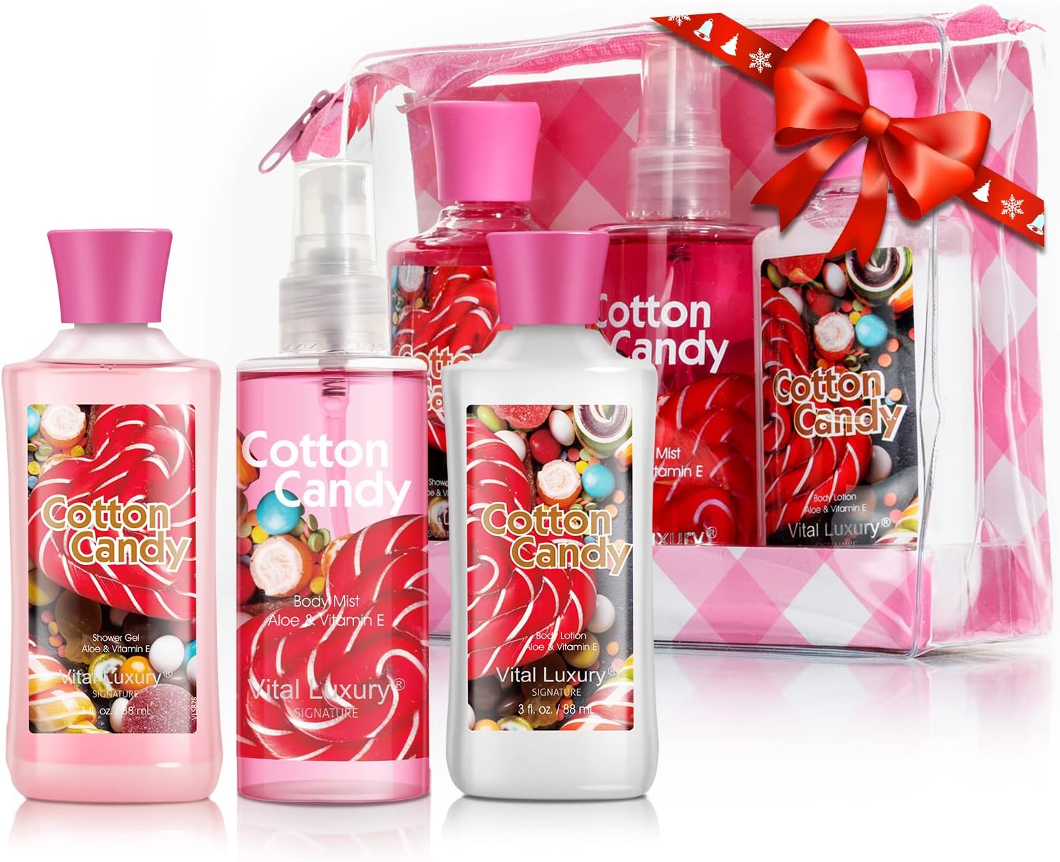 Vital Luxury Cotton Candy Bath & Body Care Travel Set, Home Spa Gift Set Includes Body Lotion, Shower Gel, and Fragrance Mist, Personal Body Care Travel Set, Birthday Mother’s Valentine’s Day Gifts