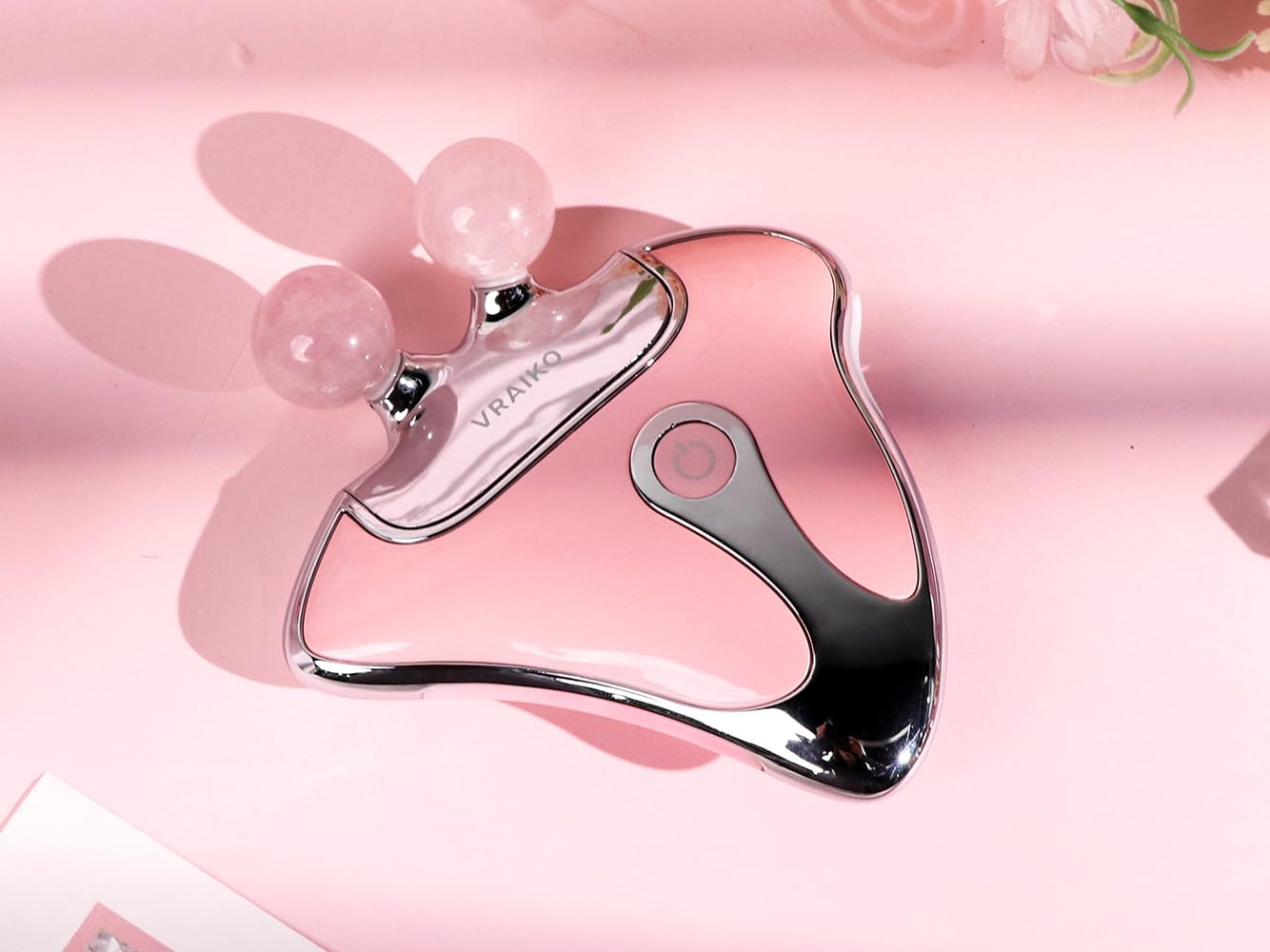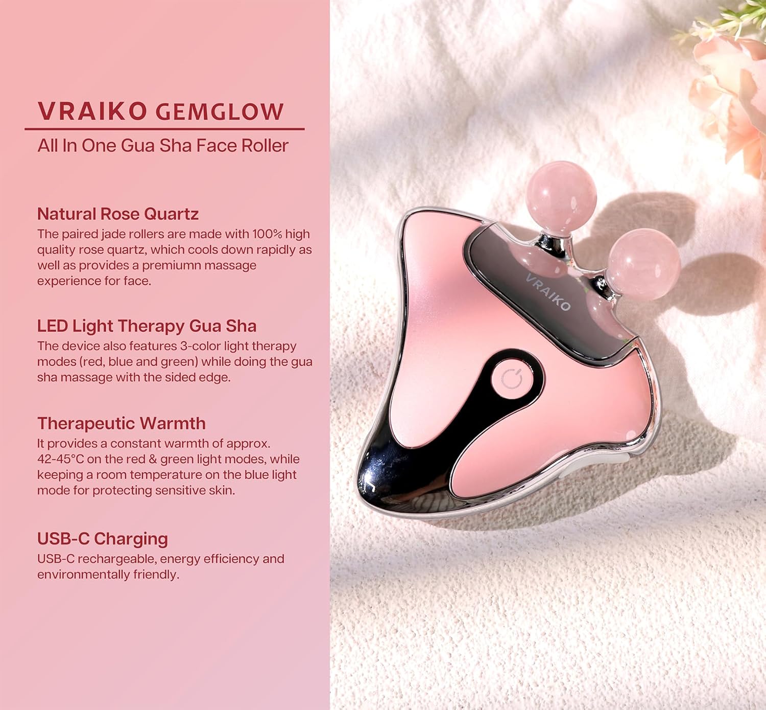 VRAIKO GemGlow Jade Roller and Gua Sha Device, 4-in-1 Gua Sha Face Tools, Face Massager with Red Light Therapy and Heat, Muscle Relaxation, Relieves Fine Lines and Wrinkles (Rose Quartz)