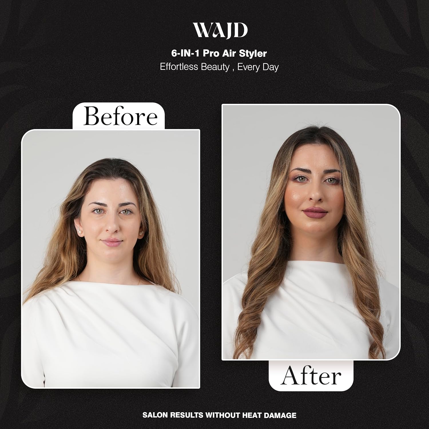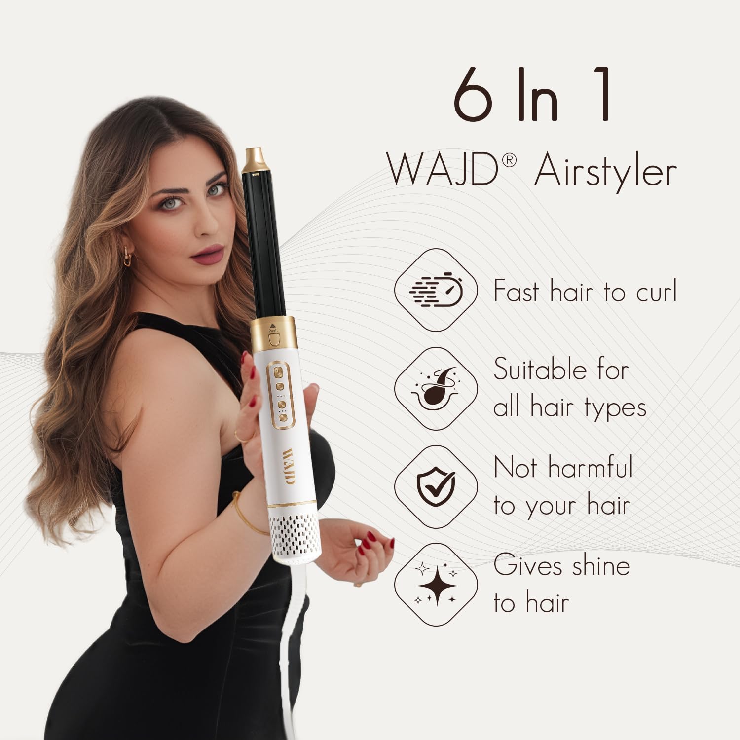 Transform Your Styling Routine with WAJD Airstyler 6-in-1 Multi-Styler & Hair Dryer Experience salon-quality results at home with the WAJD Airstyler — a lightweight, powerful tool that lets you dry, curl, smooth, and volumize without heat damage. One simple twist transforms it from a high-speed hair dryer into a versatile multi-styling wand. 6 Styling Attachments for Endless Looks Includes Auto-Wrap Curlers, large Brush, narrow Brush, Diffuser, and Storage Case — giving you the freedom to switch between sleek straight styles, bouncy curls, or voluminous waves. No Heat Damage Technology Protect your hair while styling. The WAJD Airstyler measures and regulates temperature over 1,000 times per second, ensuring consistent airflow that dries fast without extreme heat — perfect for maintaining healthy, shiny hair. Fast, Lightweight, and Easy to Use At just 1.5 lbs, this compact tool packs professional power for ultra-fast drying and styling. Customize your routine with 3 heat settings, 3 airflow speeds, and a cool shot button to lock in your look. For All Hair Types Whether your hair is straight, wavy, curly, or coily, the WAJD Airstyler is designed to deliver flawless results. Achieve smooth blowouts, defined curls, or salon-level volume — all with one device. Long-Lasting Confidence Backed by a 5-Year Warranty, WAJD ensures durability, quality, and peace of mind for years of effortless styling.