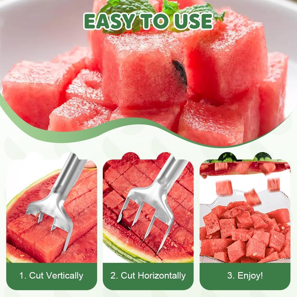 🍉 Premium Stainless Steel Construction This watermelon slicer is crafted from high-quality 430 stainless steel by a professional manufacturer. It is durable, resistant to damage, and built for long-lasting use. Featuring a wide, ergonomic handle and three sharp cutting blades, it effortlessly slices fruit into neat, uniform cubes.