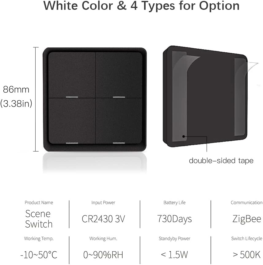 【Easy Installation】The wireless scene switch can be fixed to anywhere you like via the double-side tape. No wiring needed for simple use. Powered by 1 * CR2430 battery, up to 730 days battery life, low power consumption.
