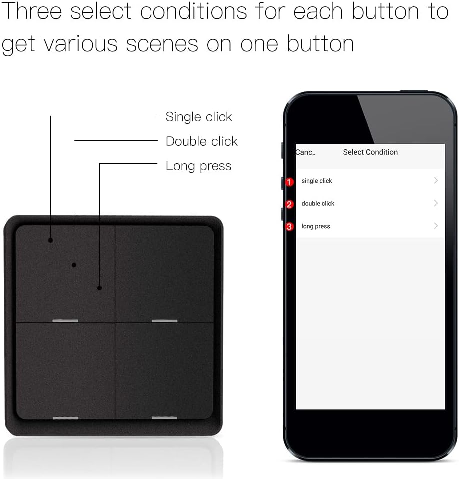 【Create Various Smart Scenes】Each button can be set up to 3 different scenes through the APP, such as sleep mode, away mode, home mode, etc. Easy to create various smart scenes to start your intelligent life style.