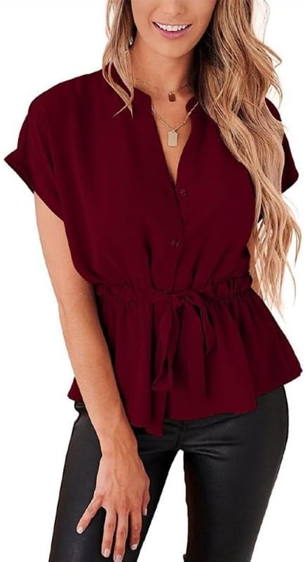 Women Button Down Blouses Short Sleeve Peplum Tops Summer Dressy Work Office Shirts Cinched Waist Top