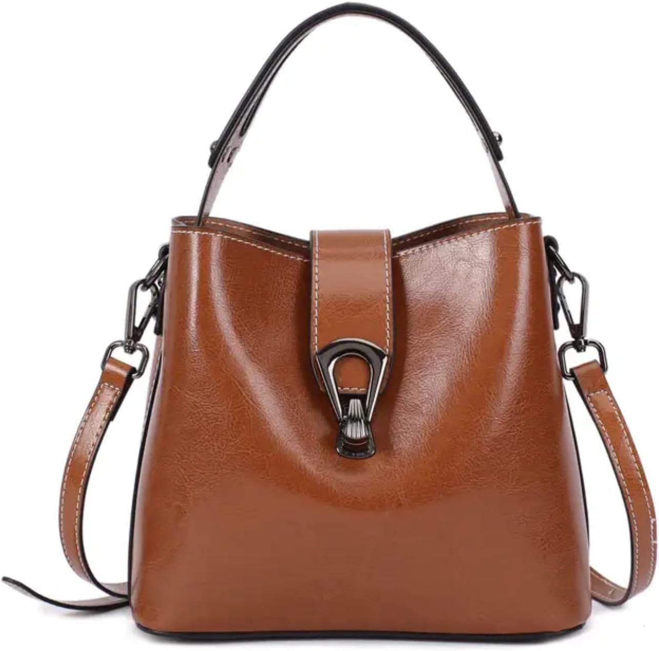 Women Genuine Real Leather Bucket Hobo Handbag, Vintage Fashion Top handle Satchel Crossbody Bag w/ 2 Straps