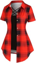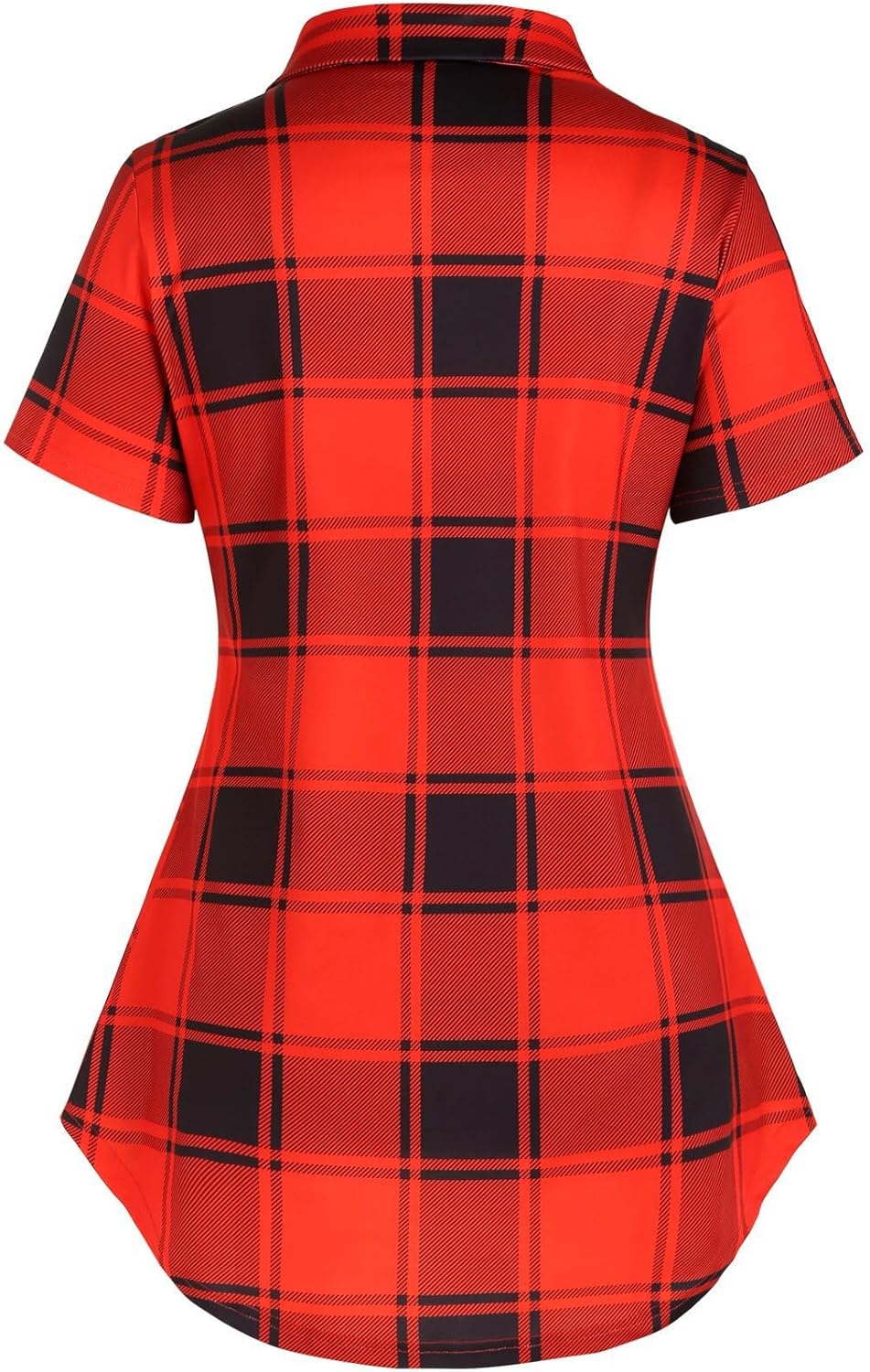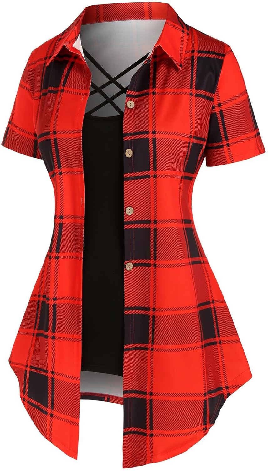 Women Short Sleeves Plaid Shirts Crisscross Mock Down Shirts Summer Tee Casual Tunic Top