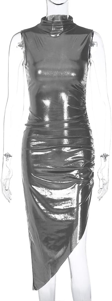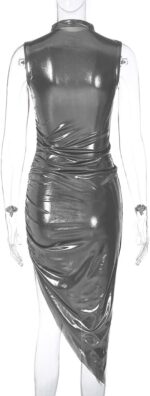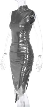 Women’s dress high-neck metallic ruffle midi dress solid color faux leather slim fit pleated sleeveless dress