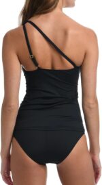 This Women’s One Shoulder Tankini Top and Hipster Bikini Bottom Set is a stylish and chic option for your swimwear collection.