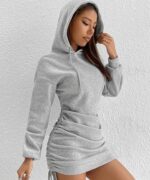 Crafted with a focus on both style and comfort, this women’s ruched side drawstring hoodie dress features drop shoulder design and a solid color finish.
