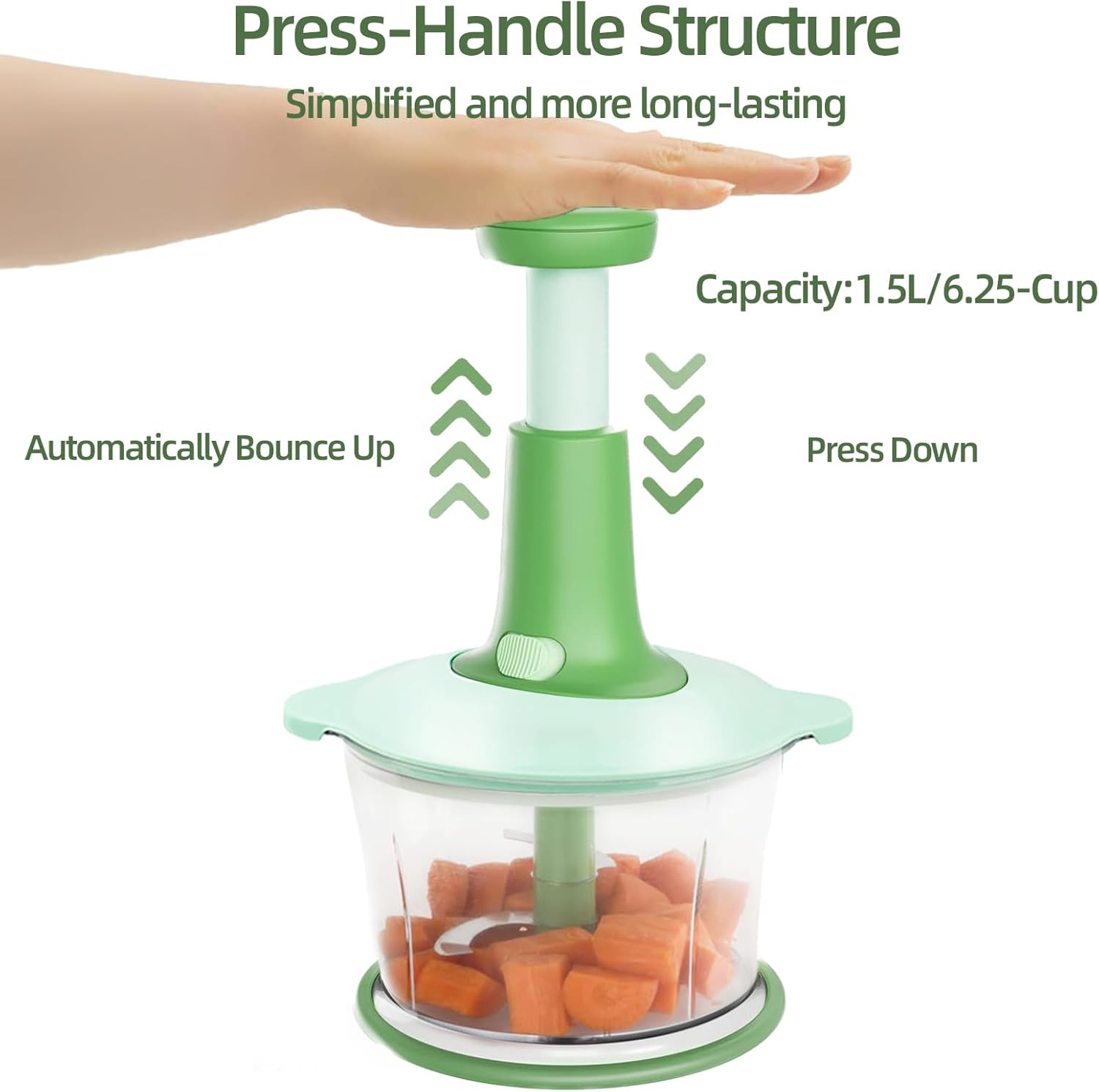 Easy to use: Powerful handheld food chopper for onions, garlic, meat, ice, baby food. Chop to desired coarseness/fineness. One-handed push action for quick veggie drying or chopping.