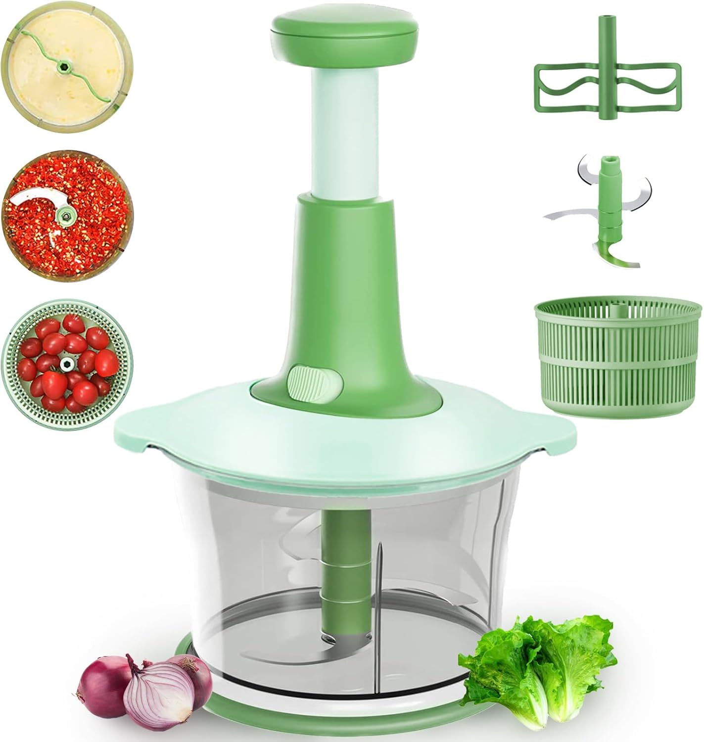 Ingenious Design: Handy chopper for dicing onion, nuts, mincing garlic. Works as salad spinner for drying veggies and fruits. Mixer blade for effective mixing. Faster prep & cleanup.