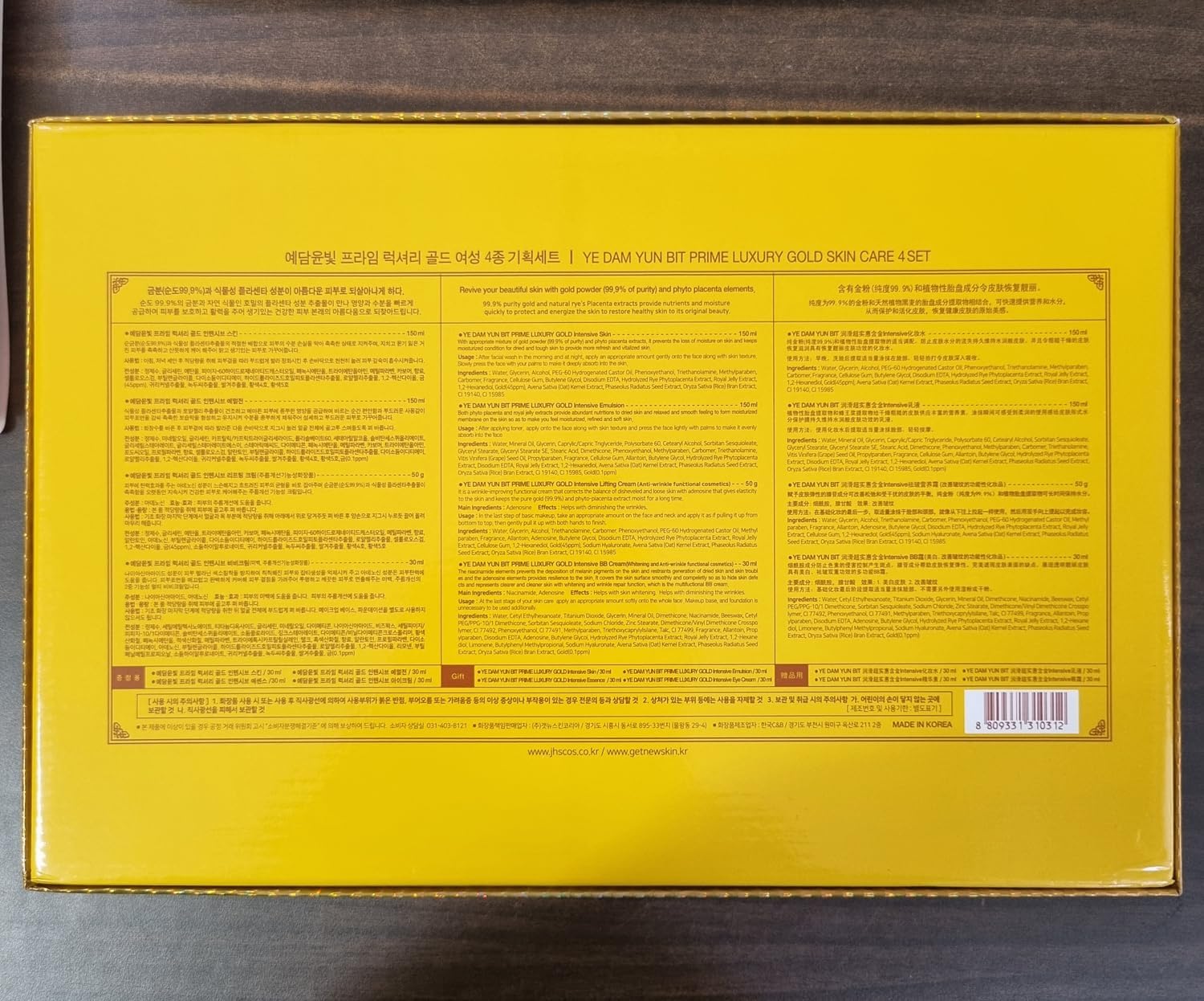 Prime Luxury Gold Intensive Skin: With appropriate mixture of gold powder(99.9% of purity) and phyto placenta extracts, it prevents the loss of moisture on skin and keeps moisturized condition for dried and tough skin to provide more refresh and vitalized skin.