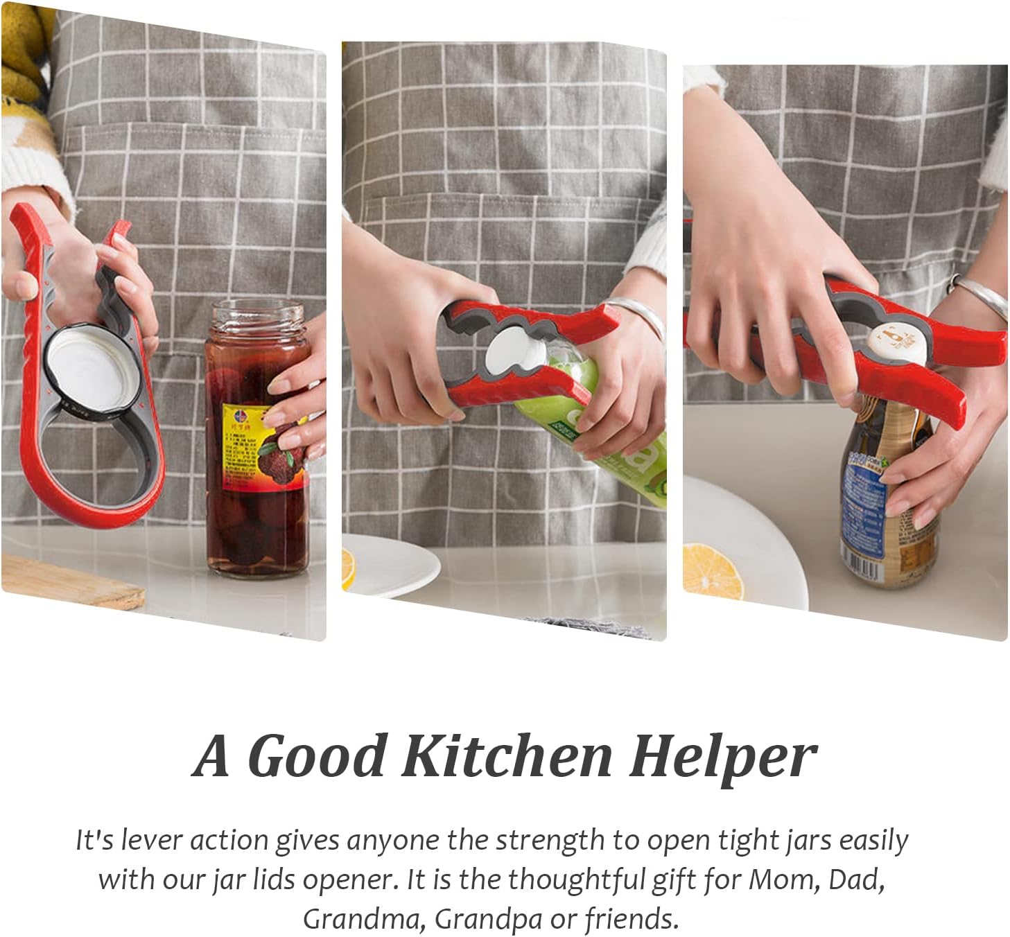 1. Its leverage action gives anyone the strength to open tight jars with our jar opener.
