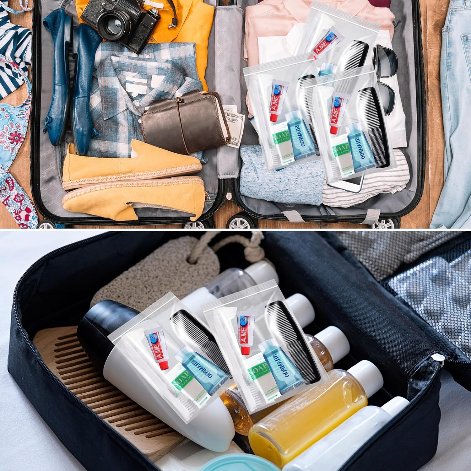 Our travel kits for women men, available in a pack of 60, combine convenience and goodwill. All items are compactly packed in a clear zipper bag, projected to lessen your travel burden and fit effortlessly in your luggage.